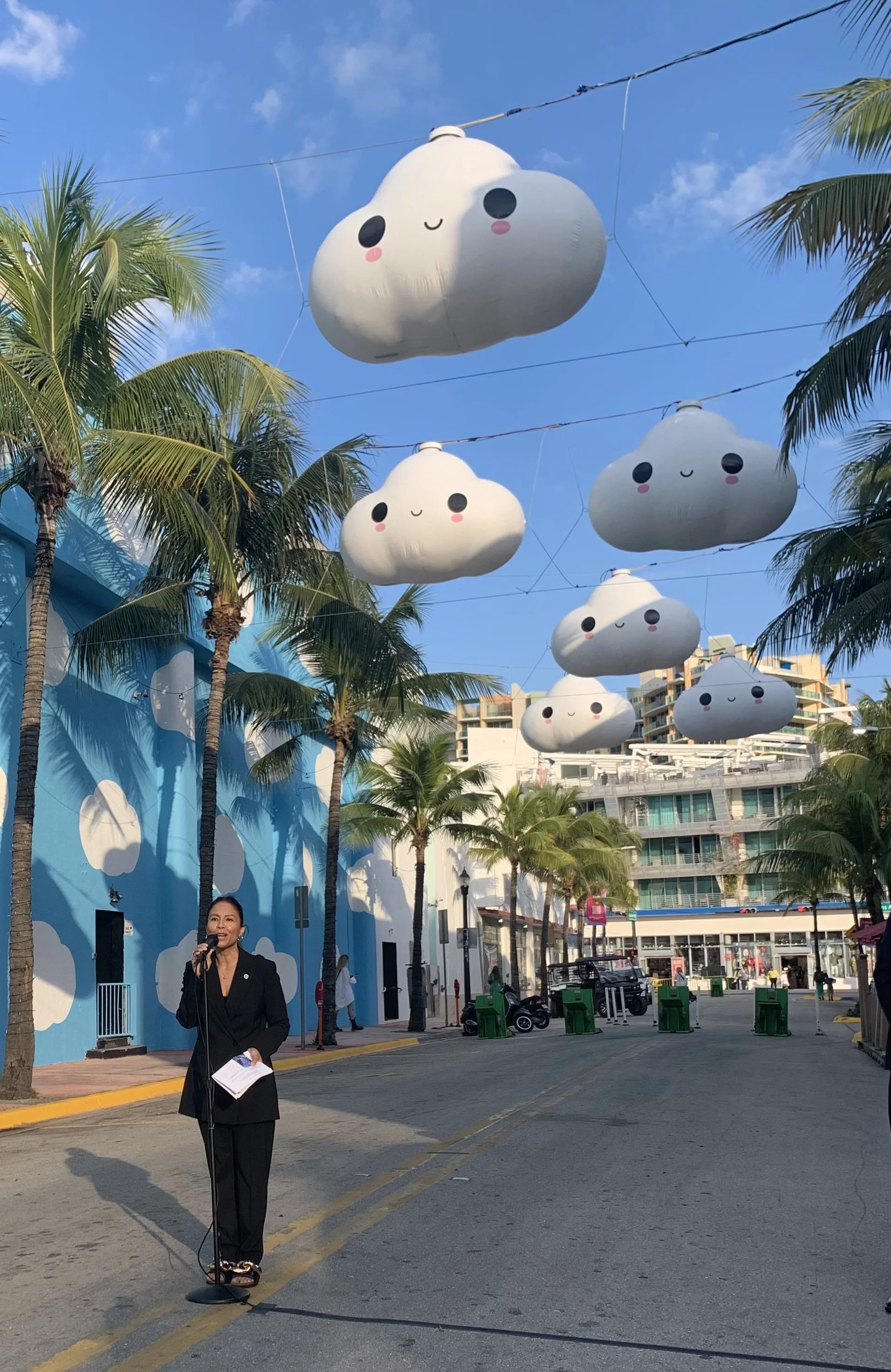 Opening reception for FriendsWithYou “Little Cloud Sky,” 2021-2022, commissioned by the City of Miami Beach. This temporary art installation is a creative placemaking project to bring pedestrian connectivity between Ocean Drive and Espanola Way districts.